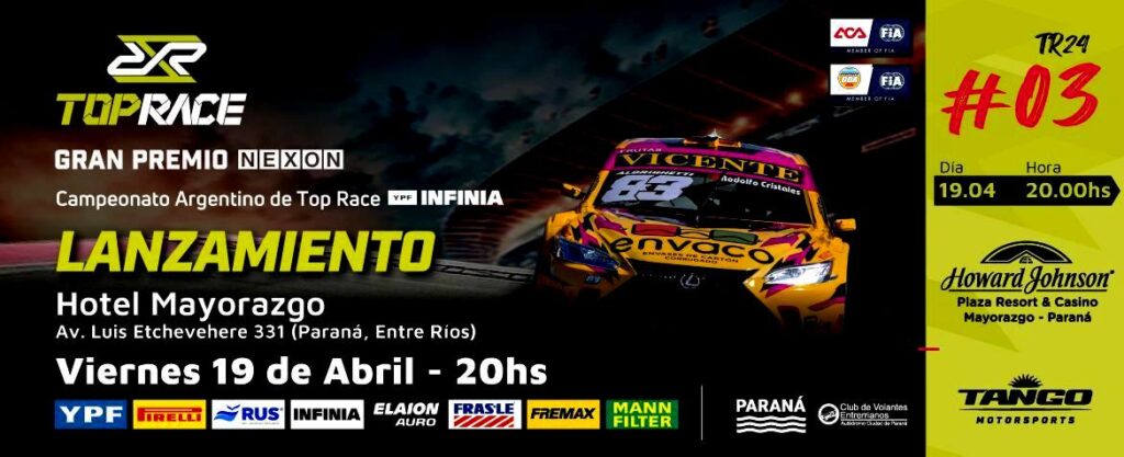 Este viernes 19 de abril a las 19.30 hs., se realizará el lanzamiento oficial de la 3º fecha del 30º Campeonato Argentino de Top Race YPF INFINIA ”Gran Premio NEXON”, que se llevará a cabo el 20 y 21 de abril en el Autódromo Ciudad de Paraná, provincia de Entre Ríos.