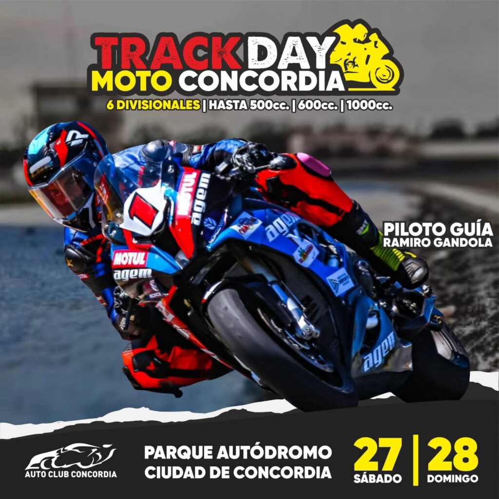 Dándole continuidad a la nutrida agenda del Parque Autódromo Ciudad de Concordia, este fin de semana será el turno de las dos ruedas con la primera edición del Track Day de Motos organizado por la Comisión del Auto Club. La actividad comenzará el día sábado con la presentación oficial del evento y posterior charla a cargo del piloto internacional Ramiro Gandola. Serán dos días a pura velocidad. La entrada tendrá un costo de $2000 para no socios, mientras que menores de 12 años, jubilados y personas con discapacidad, no abonarán ingreso.